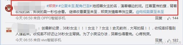 对于这种现象,有网友表示郑爽在《立夏未至》中已经沦为配角, 她担着女主的名,演着镶边的戏。扛着宣传的旗,背着收视的锅,郑爽的剧一秒也会看。 继续收看夏至未至,郑爽友情客串饰立夏。还有网友直接嘲讽“创最新纪录,36秒女主!!!史无前例,大写的服!!”火影忍者剧情介绍