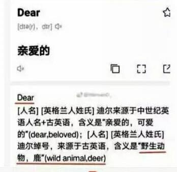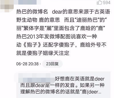 除了鹿晗和迪丽热巴在跑男中的互动之外,近日还有网友发现了他们之间的这2种巧合。其中一个就是热巴的微博名称,关注胖迪的人都知道她的微博名称为“Dear-迪丽热巴”,而这个微博名称是热巴在参加跑男之前就有的。其中,对于“Dear”这个词汇,有网友查阅之后表示:Dear的意思在古英语中有鹿的意思。