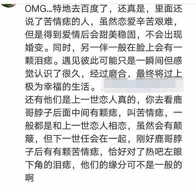 而关于俩人的另一种巧合,就是热巴右眼角下的泪痣以及鹿晗脖子后边的苦情痣了。据说在传说中拥有泪痣和苦情痣的两个人不仅是上一世的恋人,还是这一世命中注定的恋人。