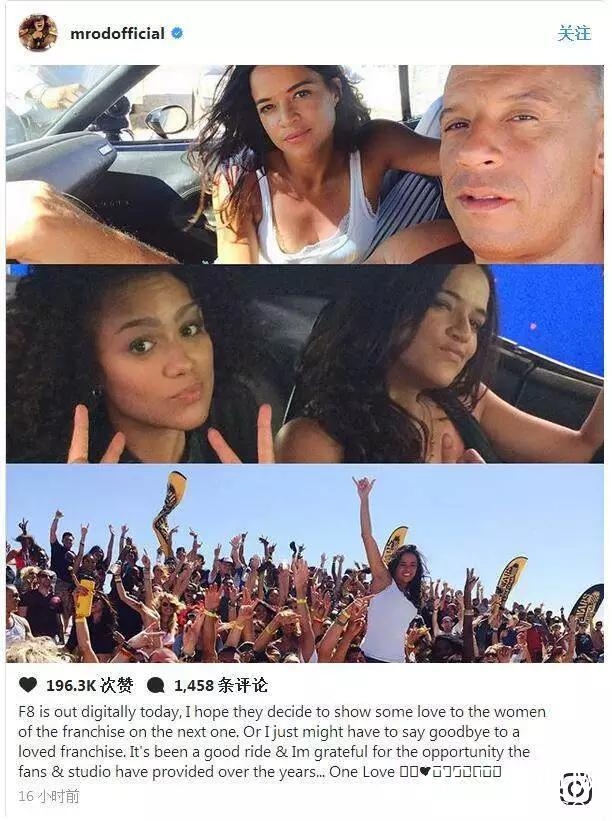 近日,“莱蒂”的扮演者米歇尔·罗德里奎兹在社交网站上发声,针对自己能否出现在下一部的《速度与激情9》中表达了态度:“我希望他们能够在下一部系列中,对女性角色展现更多的爱,否则我可能就要跟这个我深爱的电影系列告别了。”