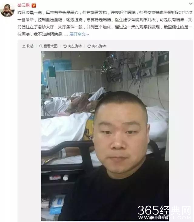 岳云鹏的母亲在前一天的凌晨1点犯病送往医院,经过一番诊断,控制血压血糖,输液退烧,才稳定了病情。