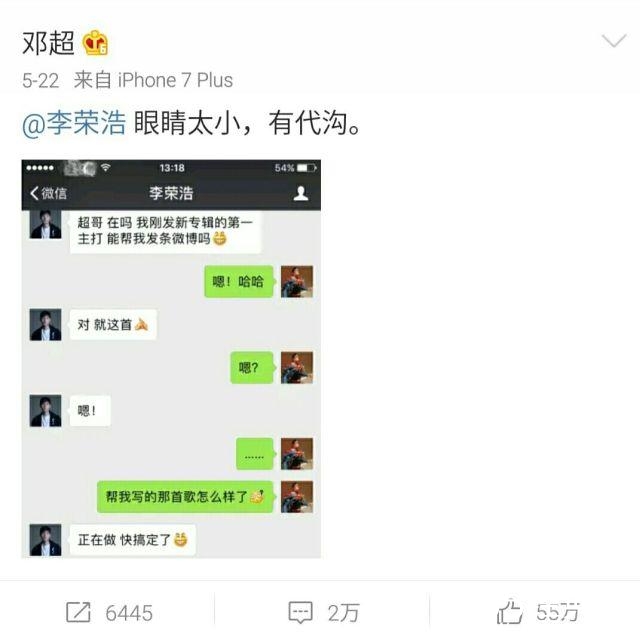 帮李荣浩宣传新专辑时直接发了聊天记录:嗯?嗯!你没看错这首专辑的名字就叫‘嗯’。