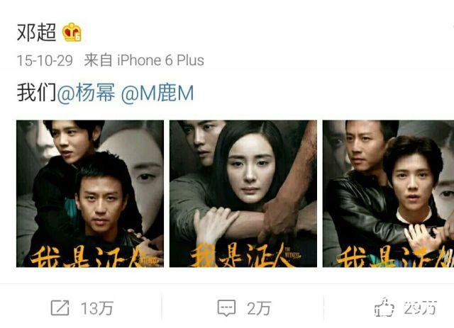 除了微博喊话,最具邓超特色的宣传方式大概就是神p图了,帮忙宣传鹿晗和杨幂的《我是证人》,毫无违和感。
