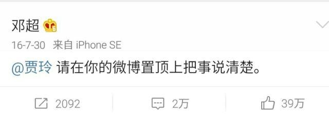 最有名的大概就是去年邓超发微博艾特贾玲并称:请在你的微博置顶上把事情说清楚。网友见状皆是一头雾水,难道邓超开撕贾玲了?