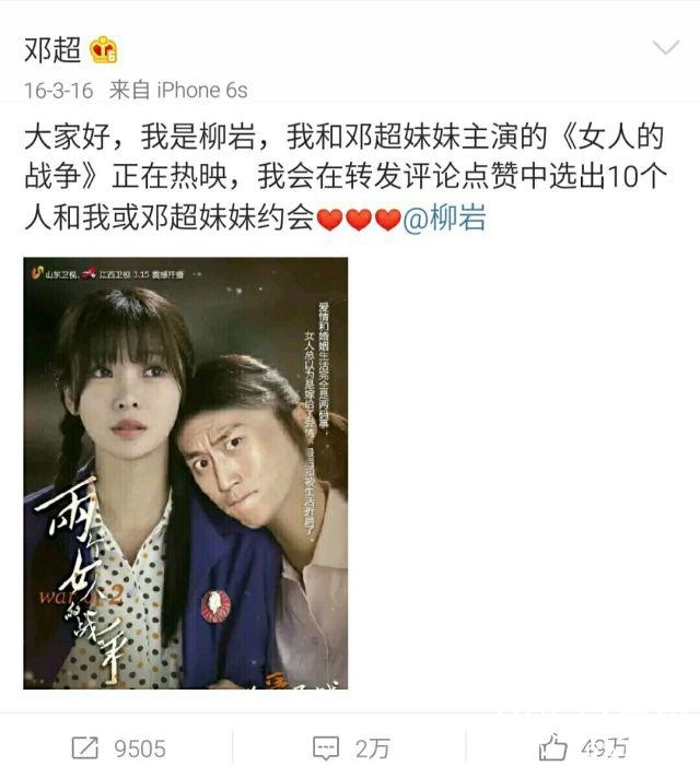 但为柳岩宣传《女人的战争》时画风就有点感人了,转发评论点赞中选十个可以和邓超妹妹约会???超哥你也太拼了吧。