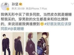 除此之外,孙坚与女星袁姗姗也互动频繁,网络上的通稿有很多关于两人关系的猜测,孙坚在微博也曾发布过与袁姗姗衣着同款的照片,两人成功笼络了一批“CP粉”的好感。
