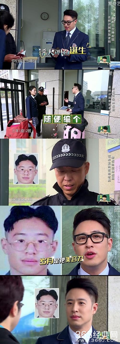 节目组专门把他当年的丑照找来做学生卡,结果潘玮柏也完全没生气,还跟门房大爷和主任开玩笑。问他哪个班的,他回了一首周董的歌,三年二班。还很配合地把眼镜摘下来,配合老师认自己哈哈哈。