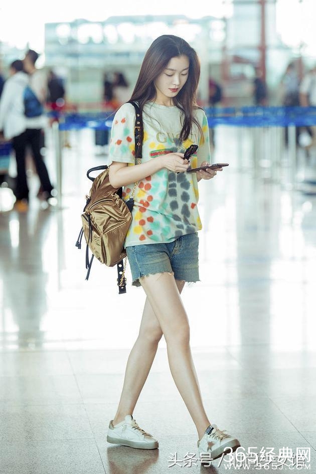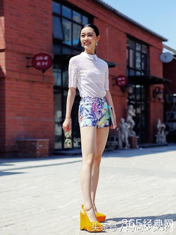 脚踩运动鞋,露出一双白花花的大长腿,不需要过多的修饰,一样有范。