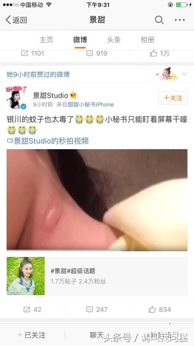 而景甜的粉丝看了视频后,开始纷纷留言表示心疼景甜。更有网友说:“看见大甜甜好心疼啊!这蚊子咬的真狠!咬的真大!