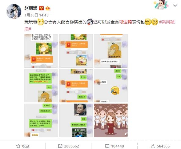 ↓↓↓过年的时候,赵丽颖发了一套可达鸭表情包,向别人讨要红包,还截了图