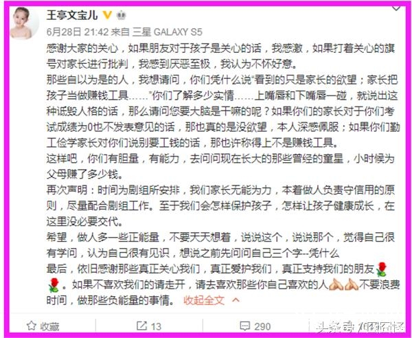 随后,王亭文的家长手动删除了这条微博,并在微博回复让网友不要无端猜测,他们并没有将孩子作为捞金工具,只是孩子懂事也有这个机会“勤工俭学”,而且既然工作就要负责,不能因为自己小就搞特殊,服从组织安排…….