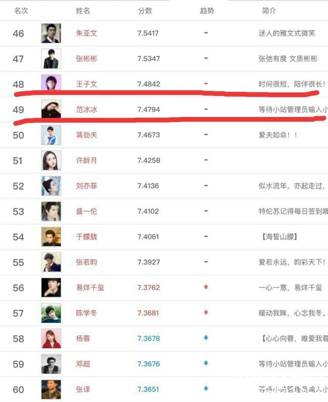 最让人没想到的是范冰冰唉,怎么都跑到49名了,按说跟李晨结婚呀什么的新闻一直以来也没断过