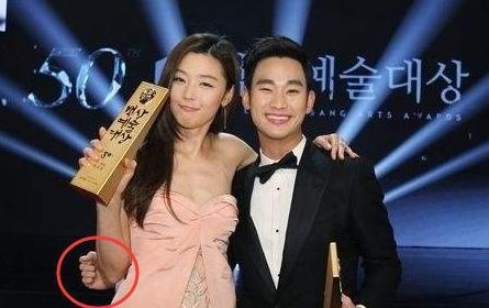 金秀贤,曾在舞台上与全智贤合影时,其实也是作势揽着她,并没有把手搭实,哈哈,不得否认的是都教授也是相当绅士哦!