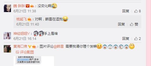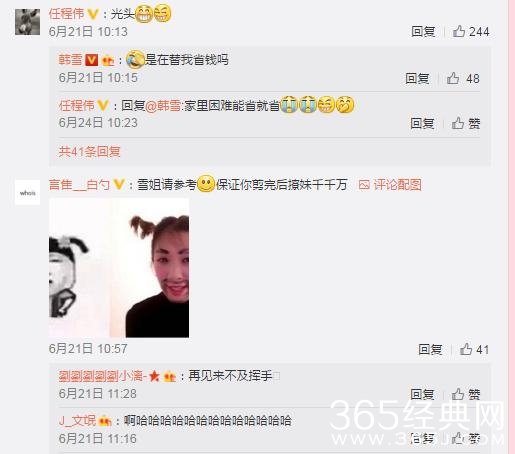 底下的评论自然是一顿赞美,不过也有那么几个奇葩的网友让韩雪去剪光头~~哈哈。当然咯,韩雪怎么可能去剪光头呢??也有网友说要看剪好发型的韩雪。