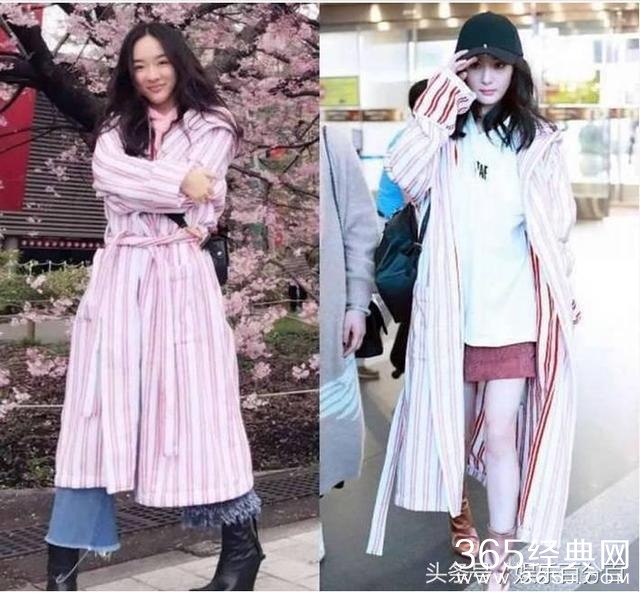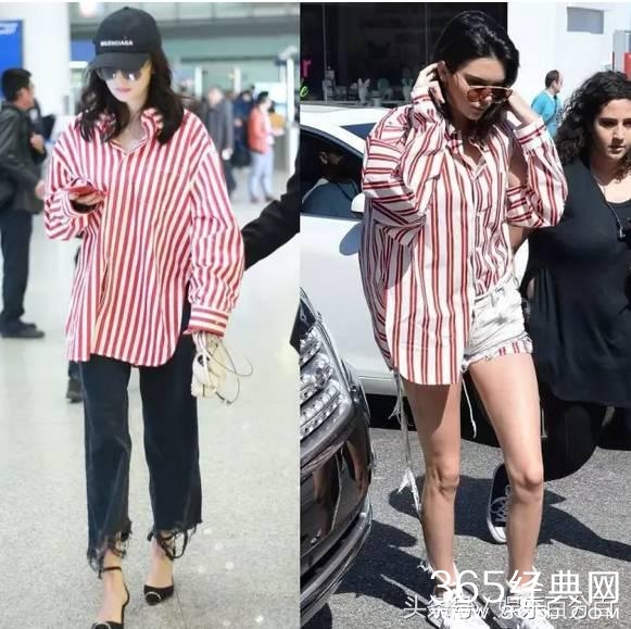 杨幂撞衫肯达尔·詹娜,亮眼的红白条纹,一杨幂搭配牛仔阔腿裤,另一位是配短裤大秀美腿,都很美。