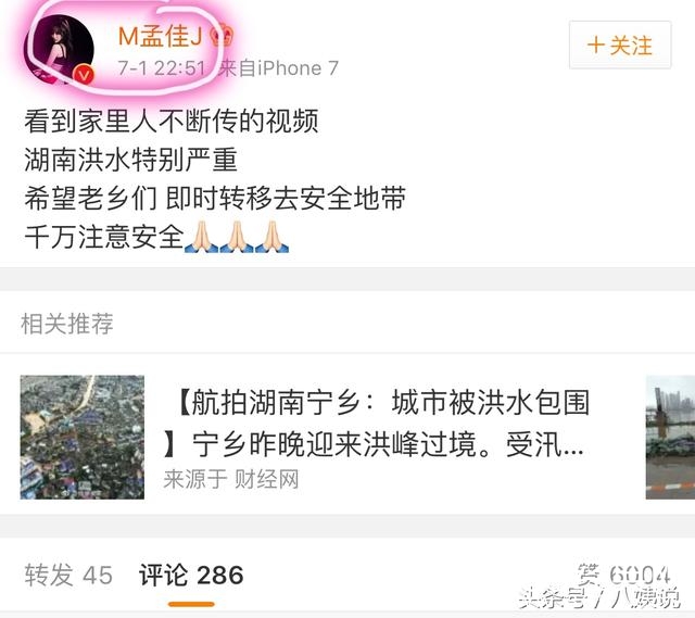 近日,湖南连日暴雨导致湖南多地遭遇洪灾,橘子洲已被洪水穿洲。这几天,就有湖南籍艺人张艺兴、孟佳发微博号召大家关注湖南灾情,盼望灾区老乡平安。