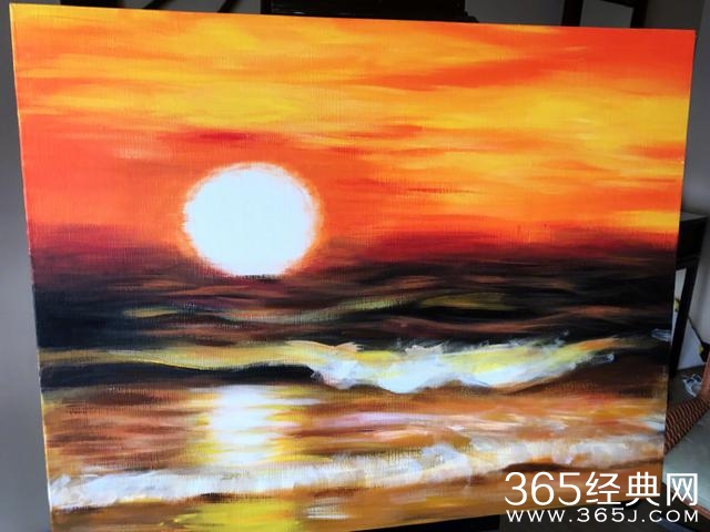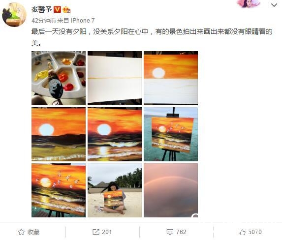 7月2日,微博晒出自己的夕阳画作,并配文:“最后一天没有夕阳,没关系夕阳在心中,有的景色拍出来画出来都没有眼睛看的美。”