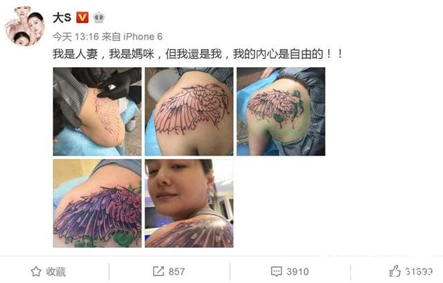 近日大S发布了为人妻为人母之后的新纹身!小编被深深震惊到了。