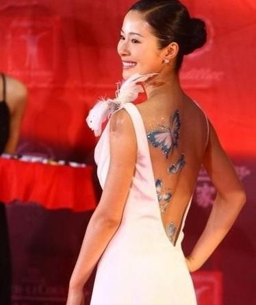 上海电影节,江一燕一袭白裙,玉背绘彩蝶的纹身夺人眼球,秒杀了不少媒体。