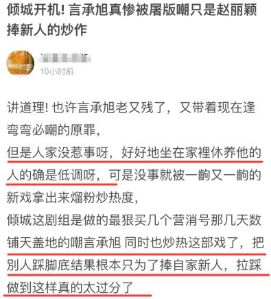 几个月前,《倾城时光》传出赵丽颖搭档言承旭的消息。对此,赵丽颖的粉丝十分气愤,他们认为男主的人选不如人意:“又老又丑又过气”,配不上颖宝。这件事让言承旭被嘲讽了好一段时间。