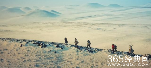 白雪皑皑的山崖,探险队步履艰难的行走着。