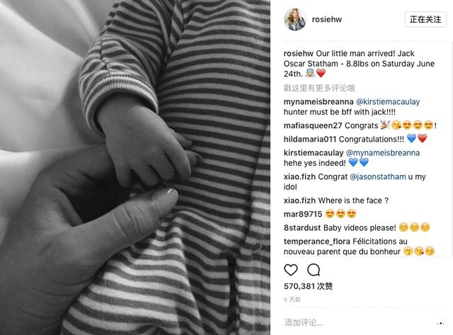 近日,前维多利亚名模罗茜·汉丁顿在自己的ins上分享了一张牵着孩子小手的照片,宣布儿子杰克·奥斯卡·斯坦森出生!