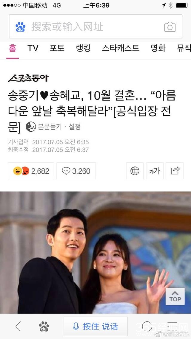 首先感谢喜爱宋仲基和宋慧乔的国内外粉丝。很抱歉这么突然宣布,宋仲基和宋慧乔将结为夫妇。并预计于2017年10月的最后一天举行结婚典礼。因为结婚并不是个人的事,而是两个家庭的相遇,所以倍感慎重。因此到结婚这步为止都万分谨慎,到现在才发布立场。希望大家能给予理解,并给两位的未来送上美好祝福。两位演员将分别向粉丝们传达这个消息,谢谢!