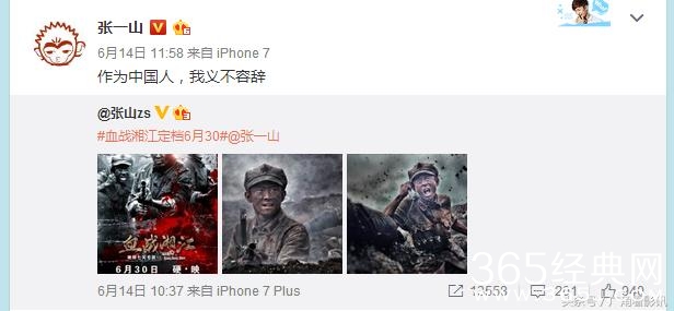 6月14号,《血战湘江》定档正式定档6月30号上映,张一山在经纪人@后发了微博,写到:“作为中国人,我义不容辞”。除此之外,在这一个月的微博里,就没有再提及这部电影的任何信息了。