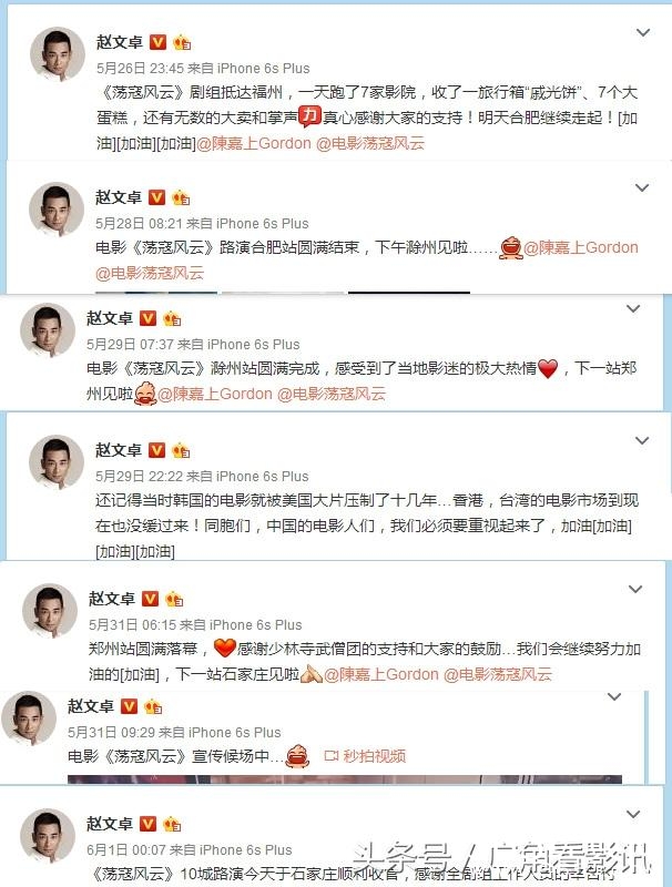5月底上映的《荡寇风云》当时票房也很惨淡,但是主演赵文卓的微博里却在不断的宣传,无论出于何种原因,对自己的作品负责的态度值得肯定!如果只是排片拿片酬,不管电影的上映效果,我想应该不是一个演员的职业操守!