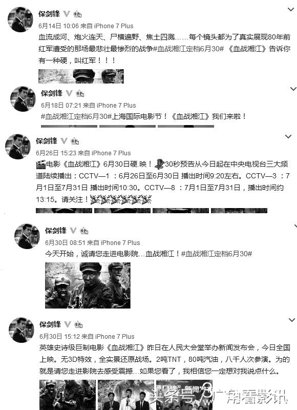 但是,在另一个主演保剑锋的微博里,反而看到了许多宣传该片的微博,从6月14号定档那天起至30号上映,有五天宣传此片的微博!也许,这样的宣传起不了多大作用,但是这也足以看出演员对这部电影的重视!