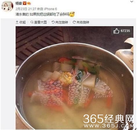 杨紫曾在微博上晒出清水煮的一锅食物,还问大家吃了会不会胖,看来杨紫很在意自己的身材呢。
