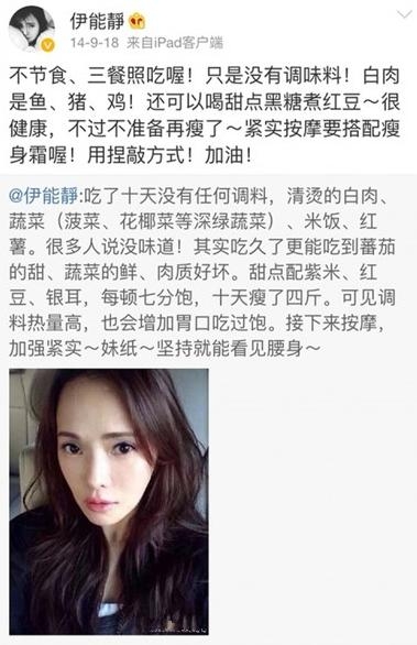 生完小米粒之后的伊能静是比之前的她胖了不少,所以她走上了恢复身材减肥的道路,她也在微博上说过她的吃食,实在是太苛刻了。