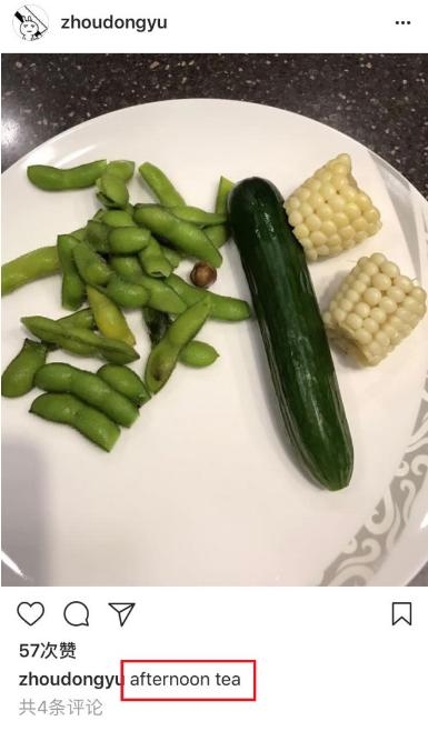 周冬雨在ins上晒出自己的下午茶,一根水果黄瓜,几个毛豆,两小节玉米这就是下午茶了吗?难道不应该是蛋糕咖啡什么的嘛?看来周冬雨的平板身材也是吃出来了呀。