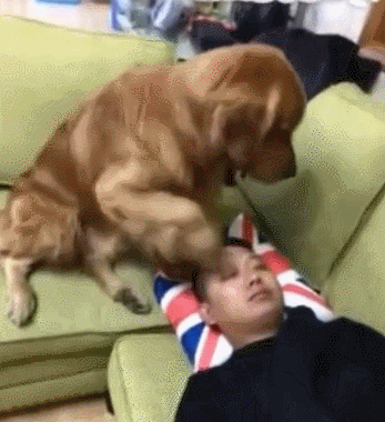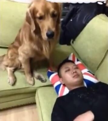 这天,男主人正在一旁睡觉,金毛狗就在一旁守着,生怕会有其他的什么会吵到男主人,于是,这个时候就有一个人来打扰男主人了......