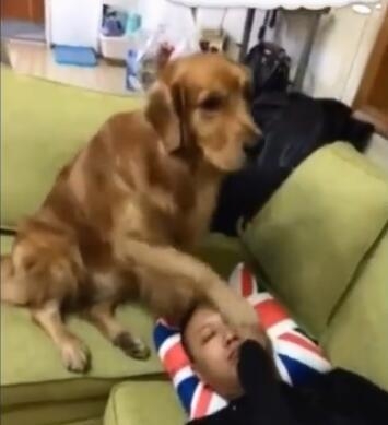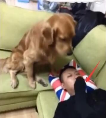 金毛毕竟还是跟男主人关系好啊,狗狗看到这个后赶紧用自己的爪子堵住男主的鼻子,毕竟现在男主人正睡着呢!
