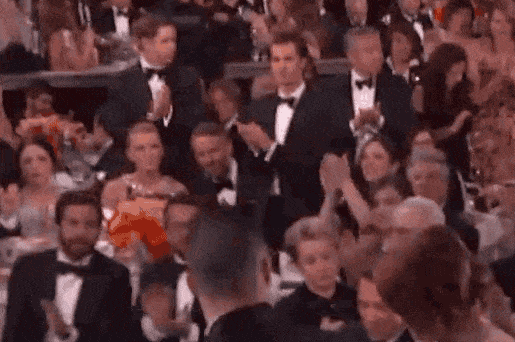 微笑、拥抱,石头姐在金球奖上台领奖时,加菲站的笔直,骄傲地鼓掌致意。