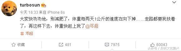 “大家快劝劝他,别减肥了,体重每两天1公斤的速度在向下掉……走路都要我扶着了,再这样下去,体重快赶上我了@邓超”。
