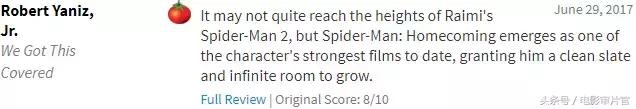 “虽然没有达到山姆·雷米版《蜘蛛侠2》那样的高度,但《蜘蛛侠:英雄归来》依然是迄今为止最优秀的蜘蛛侠电影,为这个角色提供了一个全新的背景故事和无限的成长空间。”