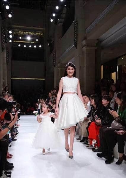 带着女儿来走秀想必是一件非常值得骄傲的事情,而且妹妹觉得虽然当时铛铛的年纪还小,但是跟着模特走还是很淡定的,头上戴着花环手里拿着花束的样子也是非常的可爱,白色仙女裙和模特的白色裙子也很搭配哦!