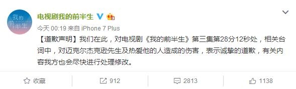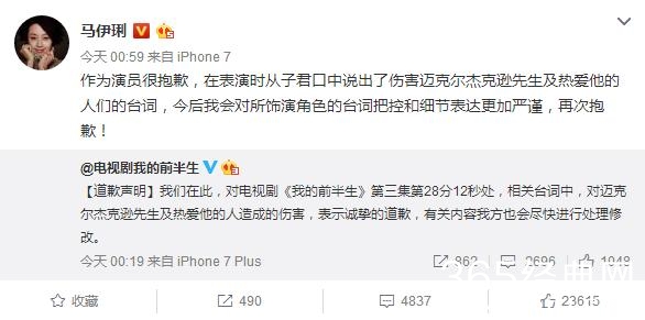 随后,《我的前半生》剧组官方微博和马伊琍紧急发表道歉申明。