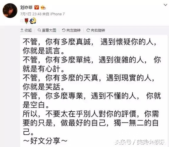 今年7月,某个夜晚深夜刘亦菲突然微博发文,照片中刘亦菲闭眼靠在猫咪身上,同时分享一段文字:“不管你有多么真诚,遇到怀疑你的人,你就是谎言。不管你有多么单纯,遇到复杂的人,你就是有心计。不管你有多么的天真,遇到现实的人,你就是笑话。不管你多么专业,遇到不懂的人,你就是空白。所以,不要太在乎别人对你的评价,你需要的只是做最好得自己,独一无二的自己。”