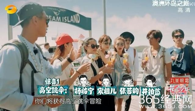 节目刚开始,宋祖儿就与杨祐宁、张若昀、井柏然因杯子里饮料的不同而抽到了高空跳伞的项目。