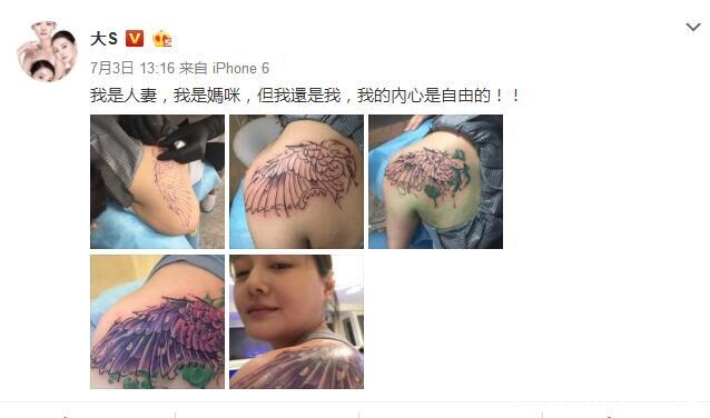 比来大S又迷上了纹身,并在微博中写到“我是人妻,我是妈咪,但我仍旧我,我的心田是自由的”
