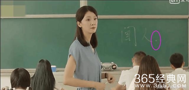 可能是为了更加的逼近现实的课堂,老师在黑板上写了两个大字之后也习惯性的用粉笔点了一下黑板,好像粉笔都被点断了,于是留下了一个大白点。可是镜头一切换,大白点就变成小白点了,难道是黑板在作祟?