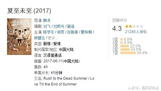 截止目前,《夏至未至》在豆瓣上被打到了4.3分,综合指数2颗星,累计参与评分人数达到21288人次。其中5星比例最少占6.8%,4星占6.9%,3星占22.5%,2星占24.5%,1星比例最高占39.4%。