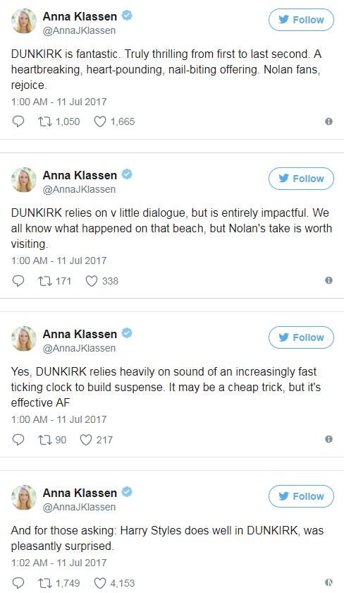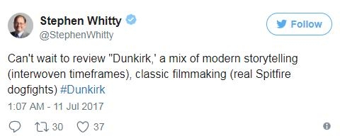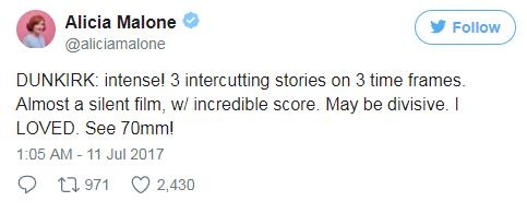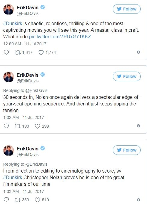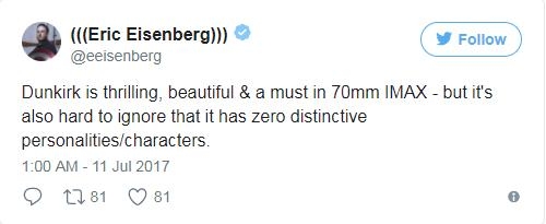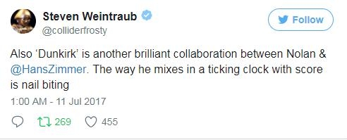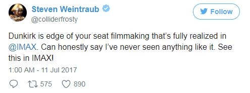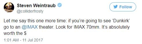 外媒Collider主编Steven Weintraub连续发表多条推文,他特别强调:一定要看IMAX版的《敦刻尔克》,绝对值回票价。而汉斯·季默为影片所作的配乐也得到了高度赞扬。