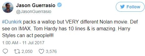 媒体人Jason Guerrasio认为《敦刻尔克》是一部非同寻常的诺兰电影,“汤姆·哈迪只有10句台词,但依旧赞爆了。哈利·斯泰尔斯竟然能够演一个普通人!”