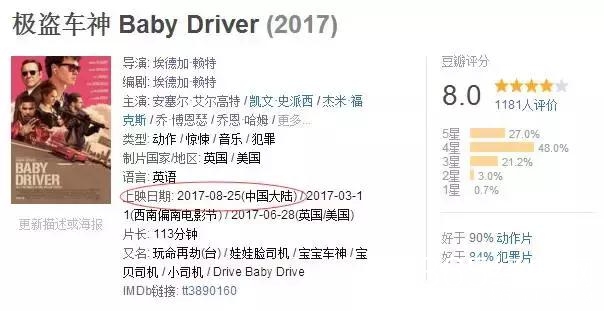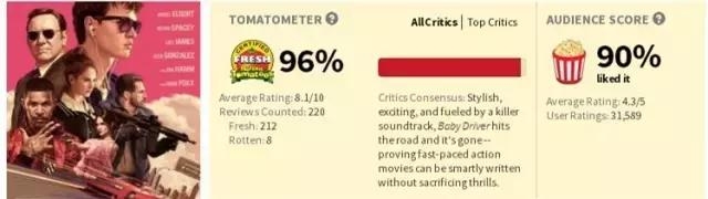 《极盗车神》已于6月28日在北美上映,先来看看口碑成绩,烂番茄新鲜度高达96%,在IMDb平台也拿下了8.5的高分。