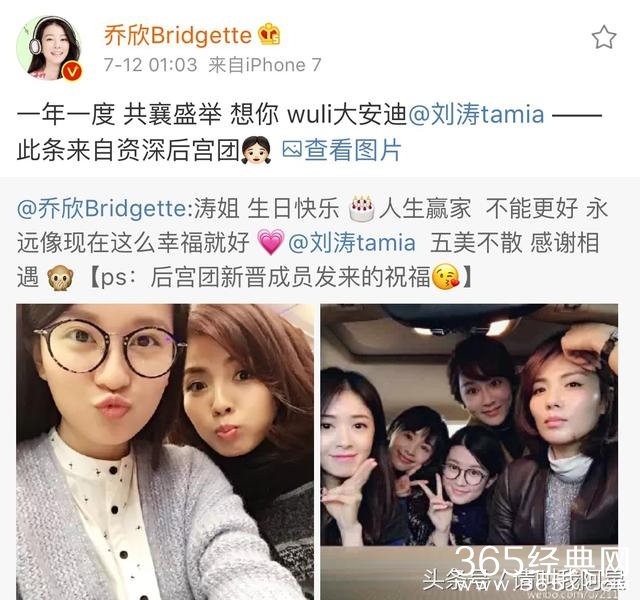 最后是《欢乐颂》五美之一的乔欣:涛姐 生日快乐 人生赢家 不能更好 永远像现在这么幸福就好 @刘涛tamia 五美不散 感谢相遇 【ps:后宫团新晋成员发来的祝福】