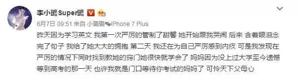 高考期间李小璐在微博分享了甜馨学英语的故事。因为对学习的抗拒,李小璐第一次严厉地管制了甜馨,可是随后甜馨完成学习任务后,李小璐也不忘给她一个大大的拥抱。